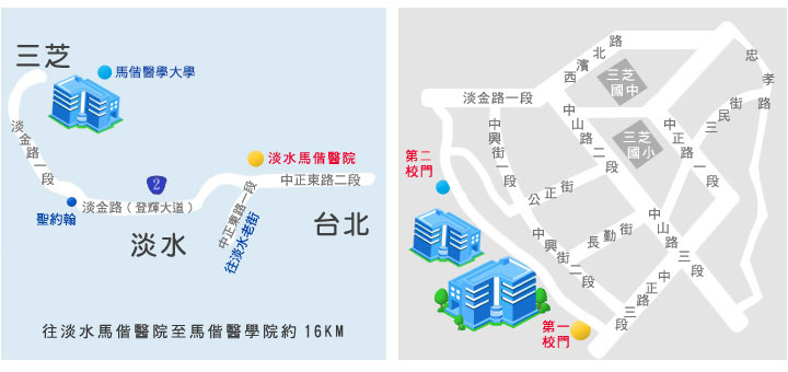 - 沿著中正東路經過馬偕醫院淡水院區。